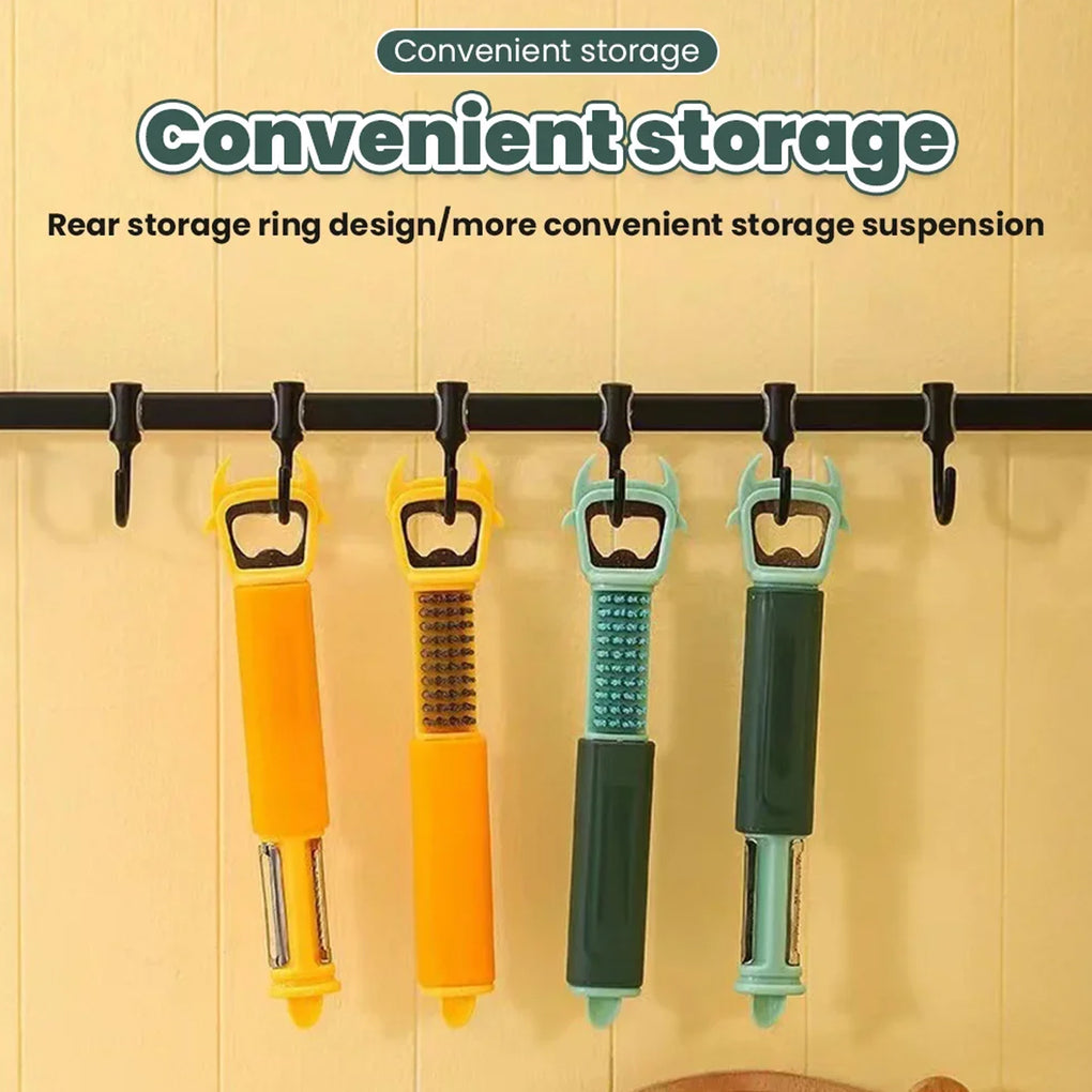 7-in-1 design: can opening, fruit peels opening, bottle opening, fruit and vegetable brush, peeling, shredding, and budding. Integrating multiple functions into one, easy to use.