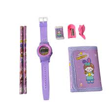 Description :- Pencils: 2 pencils included. Fun and engaging design for young fans. Ideal for writing, drawing, and schoolwork. Eraser & Sharpener: Convenient eraser and sharpener included. Helps correct mistakes easily and keeps pencils sharp for smooth writing and drawing. Perfect for school projects, crafts, and creative endeavors. Send your kids back to school in style after the holidays with our wide range of stationery gifts. They make for a great stocking filler or party gift! Package includes 1 watch, 2 pencil, 1 erasers, 1 sharpeners, 1 pencil cap & 1 small purse – A perfect return gift option for kids, girls & boys Stationary Set for Kids – Pencils are made of good quality wood easy to sharpen and erase, smooth and break resistant. Suitable Gift for Little Ones – This stationary set is the best birthday gift for kids, boys, and girls. A suitable birthday return gift, party favor gifts for kids or can be gifted on any suitable occasion. Unleash Imagination and Creativity: Encourages imaginative play and artistic expression. Lets kids explore their creativity and engage in inspired activities. Pack of 7 Sets Dimension :- Volu. Weight (Gm) :- 265 Product Weight (Gm) :- 92 Ship Weight (Gm) :- 265 Length (Cm) :- 25 Breadth (Cm) :- 17 Height (Cm) :- 3